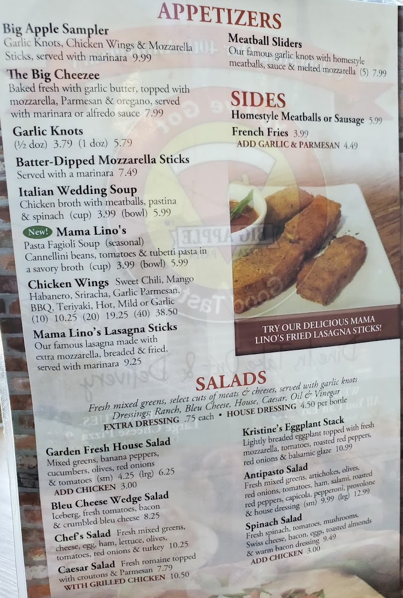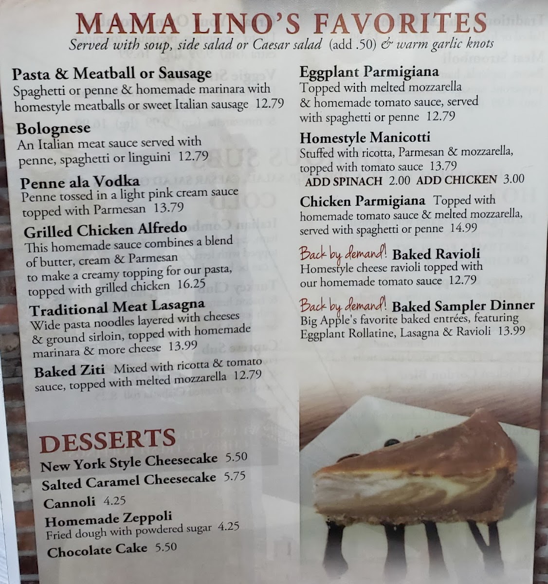 Big apple’s favorite trio of baked entrees, lasagna, eggplant rollatini and ravioli.